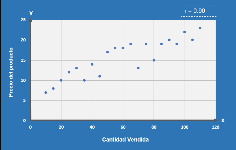 Una correlación de 0.90 indica una relación muy fuerte entre las dos variables analizadas en el diagrama de dispersión, en este caso, el precio de los productos y la cantidad vendida. Esta correlación sugiere que los consumidores están dispuestos a pagar un precio más alto por el producto. Además, puede ayudar a la empresa a tomar decisiones más informadas en términos de fijación de precios, estrategias de marketing.
